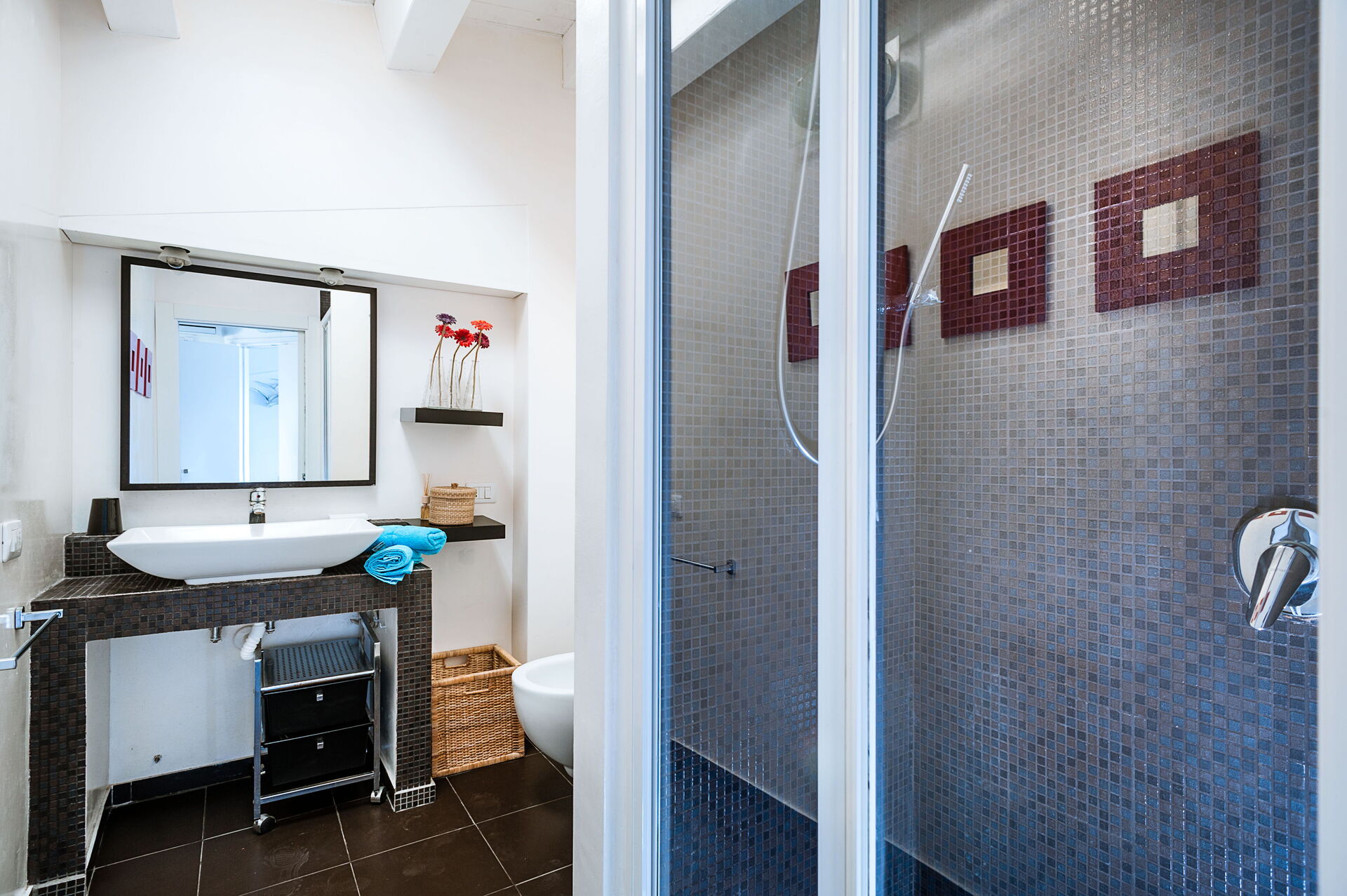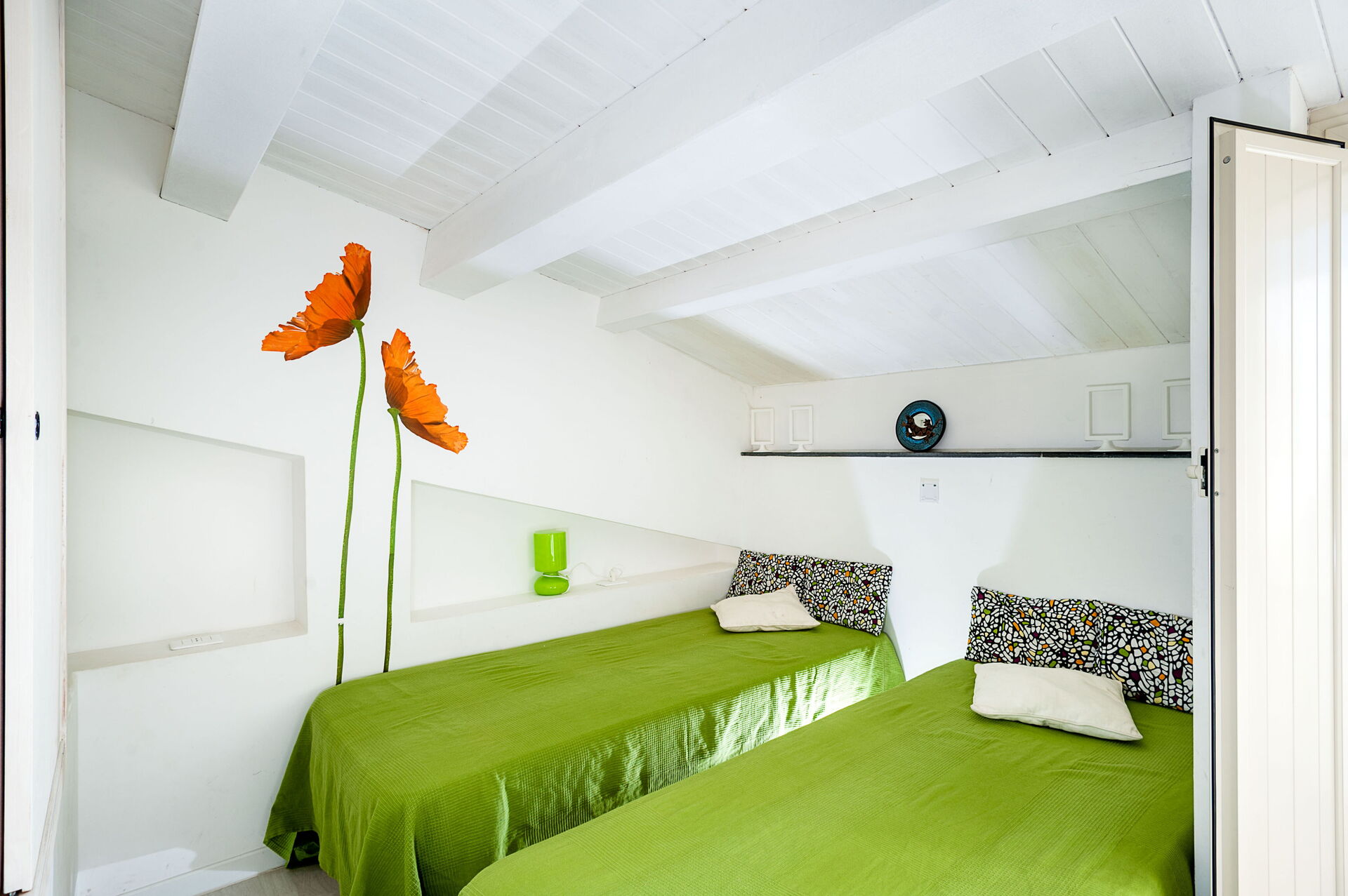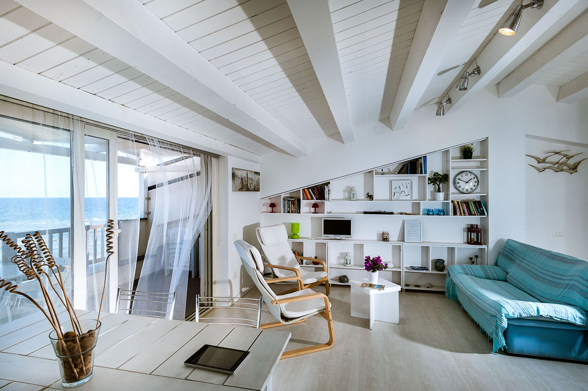 Thanks to a sliding door as big as the whole living room, the sea is clearly present in the flat. There are a bedroom with double bed, a bedroom with 2 single beds, a bathroom with shower, bidet and toilet and a living room with dining table, air-conditioning, lounge and open kitchen.