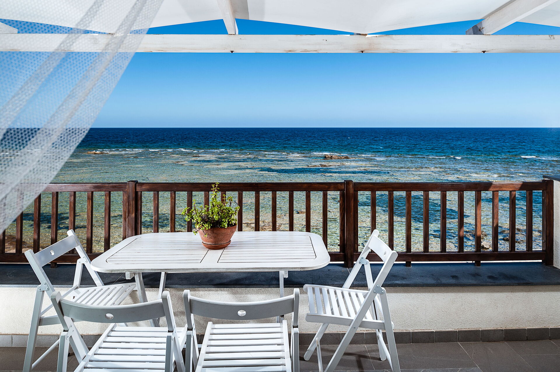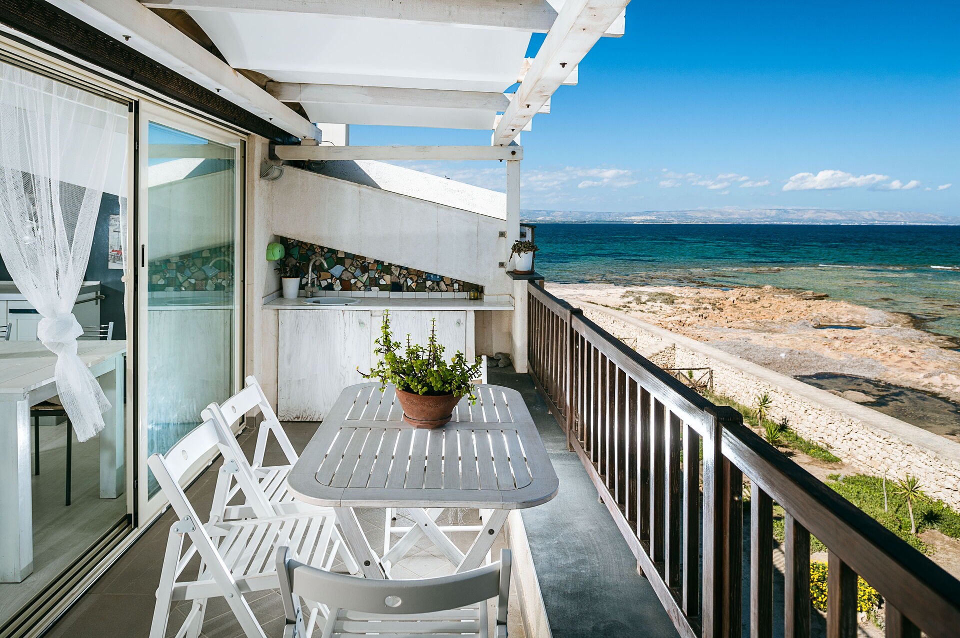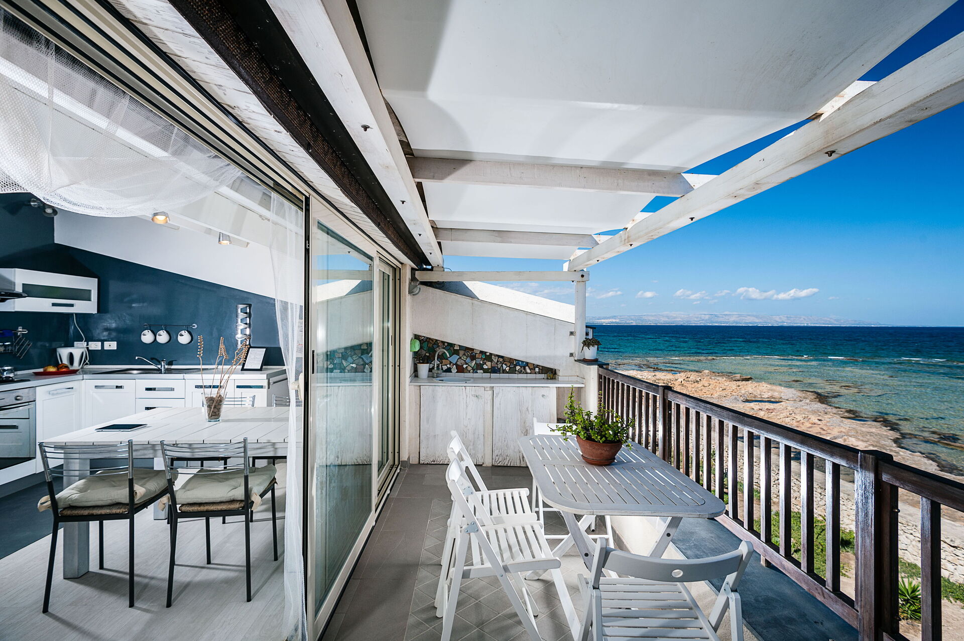 L'appartamento è perfettamente curato in ogni suo dettaglio, ha una bellissima terrazza dotata di lavandino e tavoli che si affaccia su uno splendido mare. L'appartamento si trova nel cuore di Marzamemi.