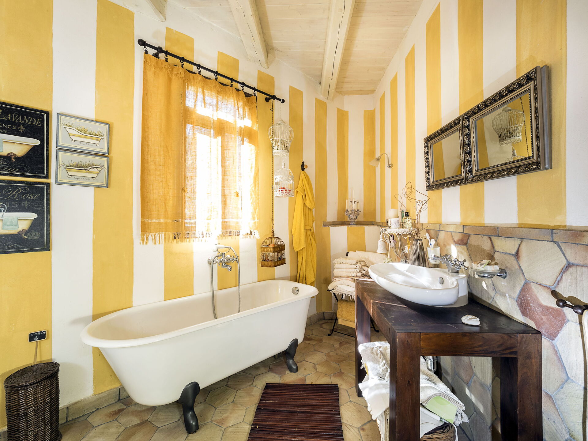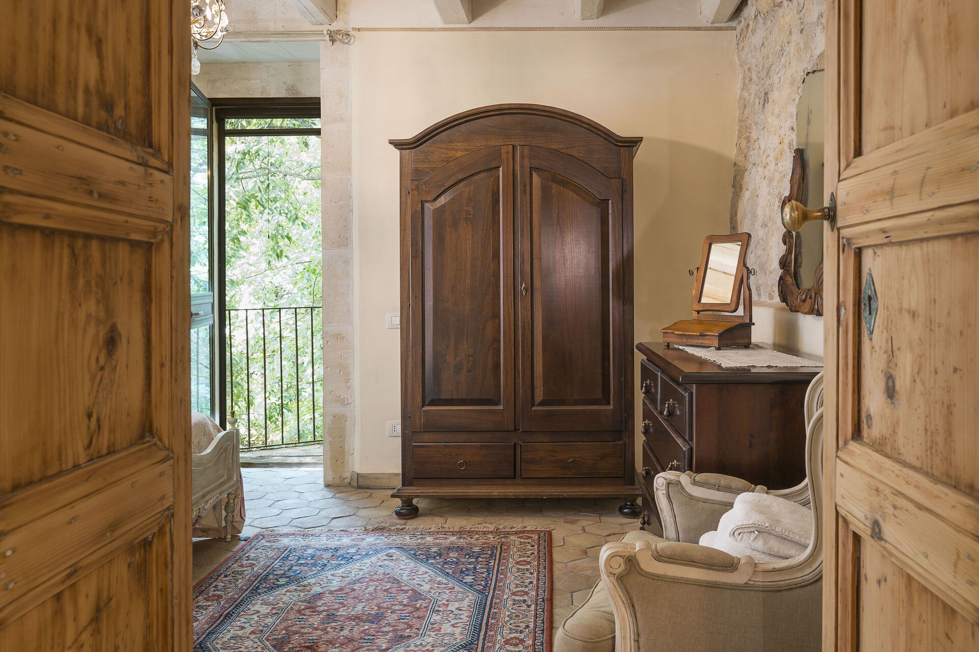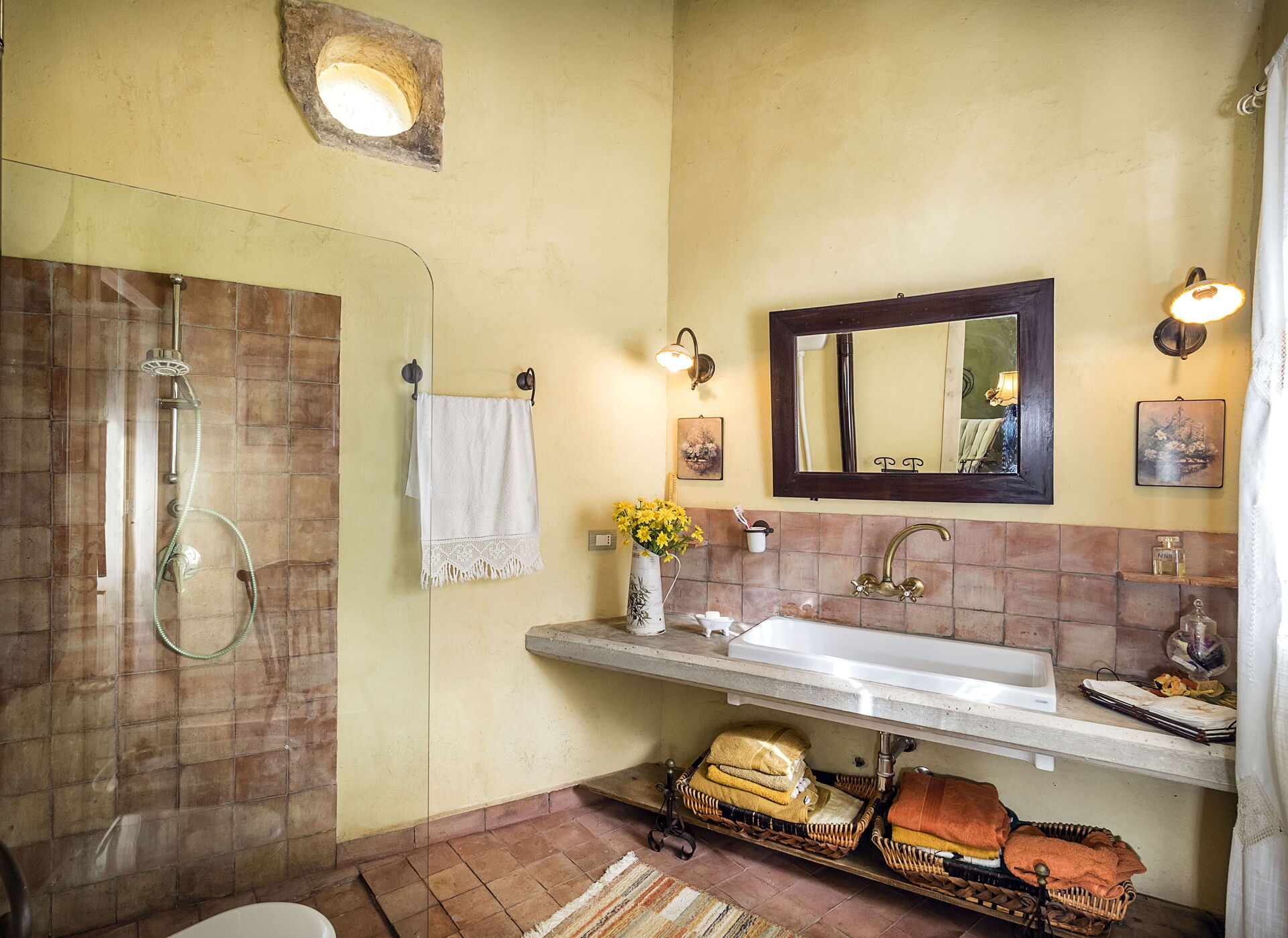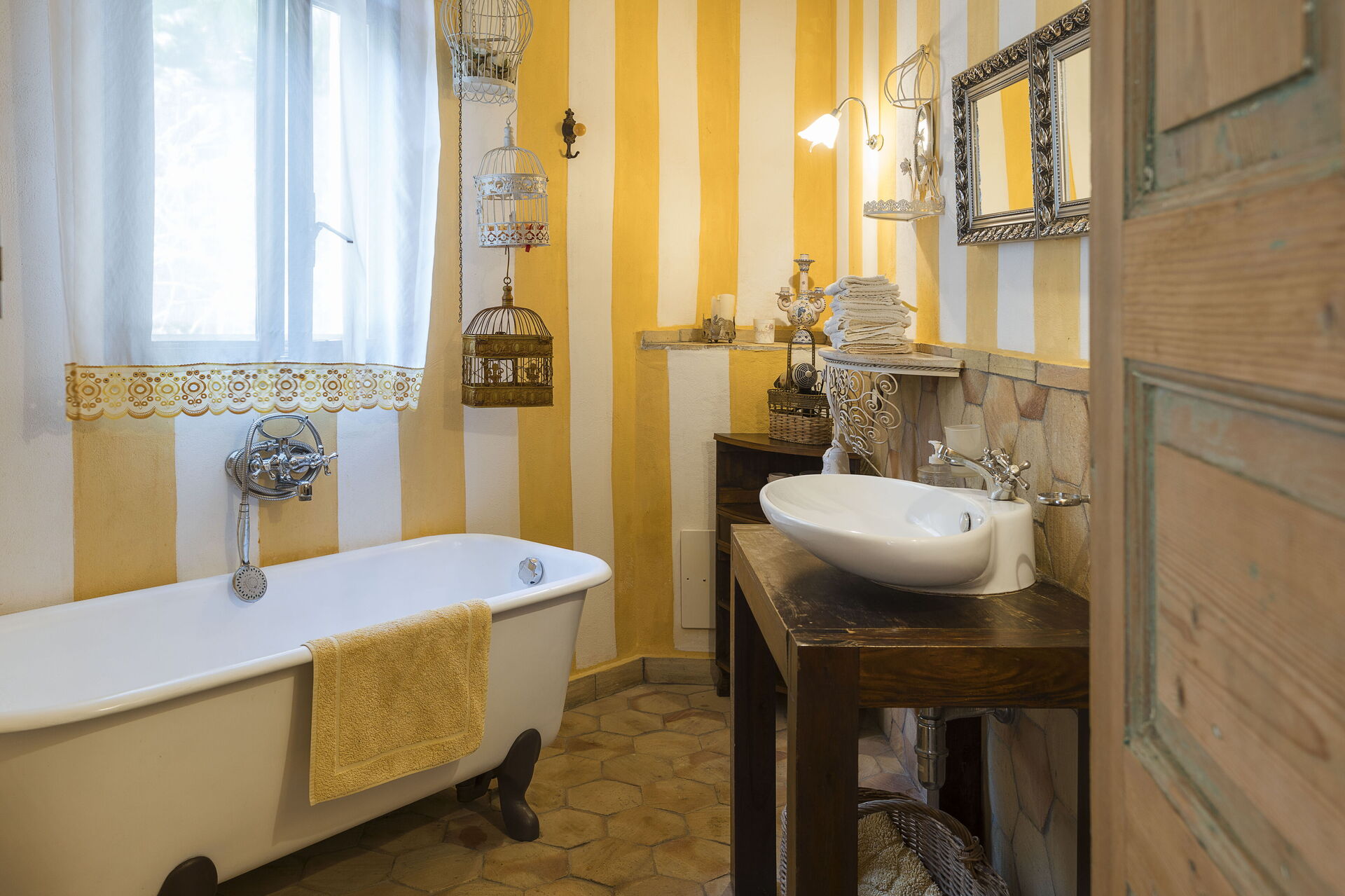 The main building has three eclectically elegant double bedrooms, and one room with two single beds. There are also two luxury bathrooms, one for each floor. A spacious dining room with a well-equipped kitchen (including a dishwasher) will be the perfect frame for all your dinners unless, of course, you cannot get enough of the stunning views of the surroundings and you prefer to enjoy your meal outdoor. The dépendance consists of a double bedroom and a bathroom and it can be a romantic hideout for a couple that wants even more privacy. There is a brand new bathroom and a changing room next to the pool.